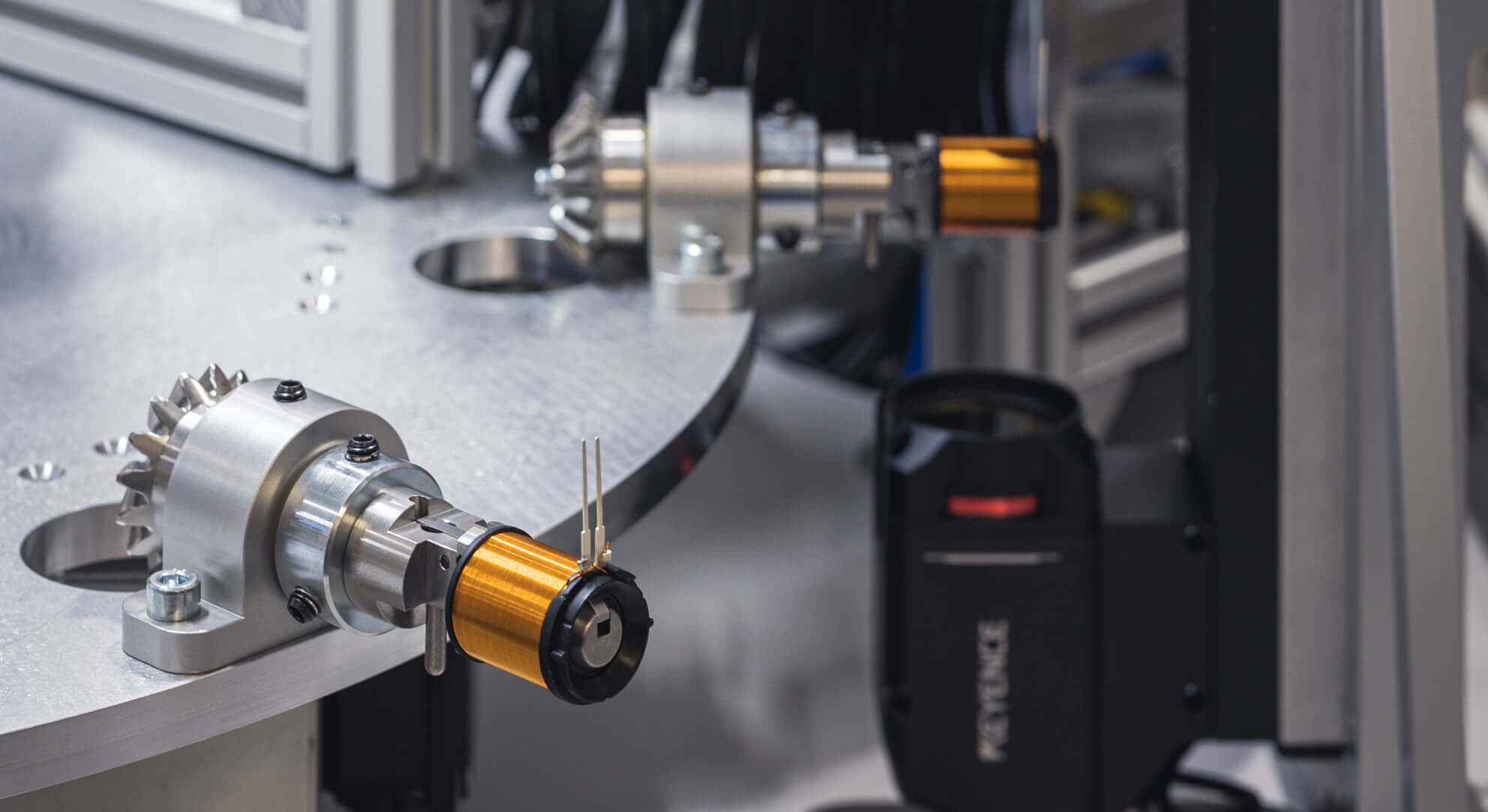 Am Rundtakttisch werden die Kontakte der Spulenkörper mit einem Schweißkopf verschweißt. The welding contacts are then checked for accuracy and quality by two Keyence cameras.